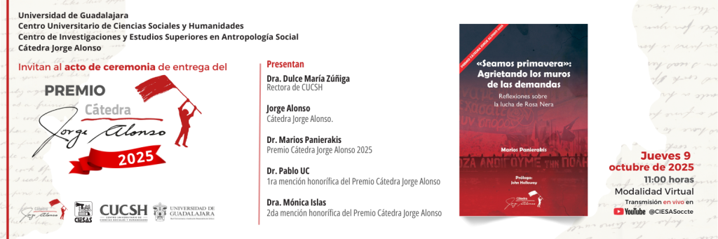 Organizada en conjunto por el CIESAS Occidente y la Universidad de Guadalajara, la Cátedra Jorge Alonso pretende convertirse en un espacio estimulante de análisis, discusión, problematización y diálogo para vislumbrar cómo se están constituyendo los movimientos sociales de nuevo tipo, sus razones y sentires, sus formas que están ensayando, además de sus logros y contradicciones.