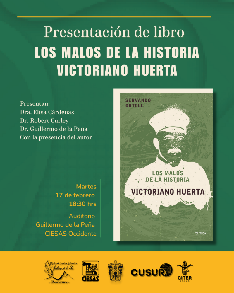 La Cátedra de Estudios Regionales Guillermo de la Peña invita a la presentación del libro "Los malos de la historia. Vitoriano Huerta". con Dra. Elisa Cárdenas, Dr. Robert Curley, Dr. Guillermo de la Peña y Servando Ortoll
