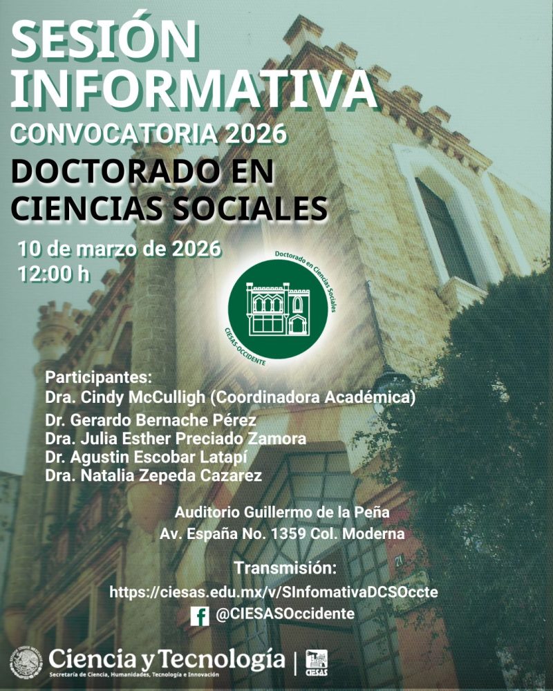 La Subdirección de Docencia del CIESAS invita a los aspirantes a ingresar al Doctorado en Ciencias Sociales, promoción 2026-2030 a la Sesión Informativa de la convocatoria, en la que podrán conocer a profundidad el Plan de Estudios y los requisitos para poder ingresar al posgrado. La sesión se llevará a cabo en modalidad híbrida por lo que los interesados podrán asistir a las instalaciones del CIESAS Occidente o registrarse para unirse a la sesión vía Zoom. De igual manera se realizara una transmisión en vivo por el Facebook del CIESAS Occidente.